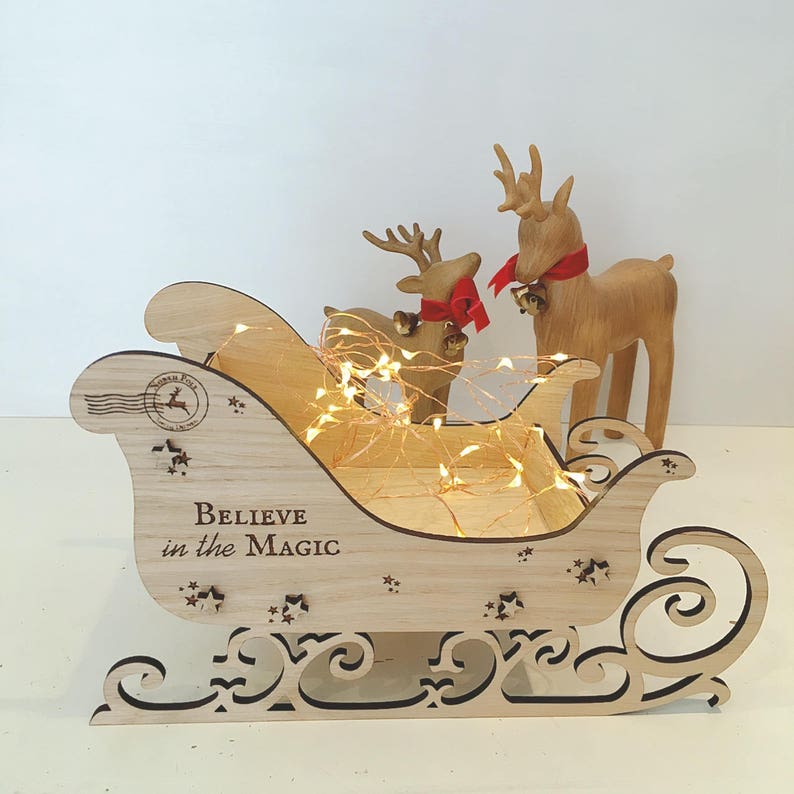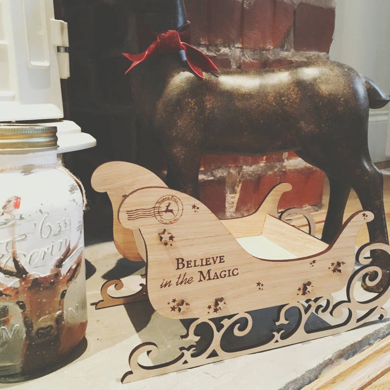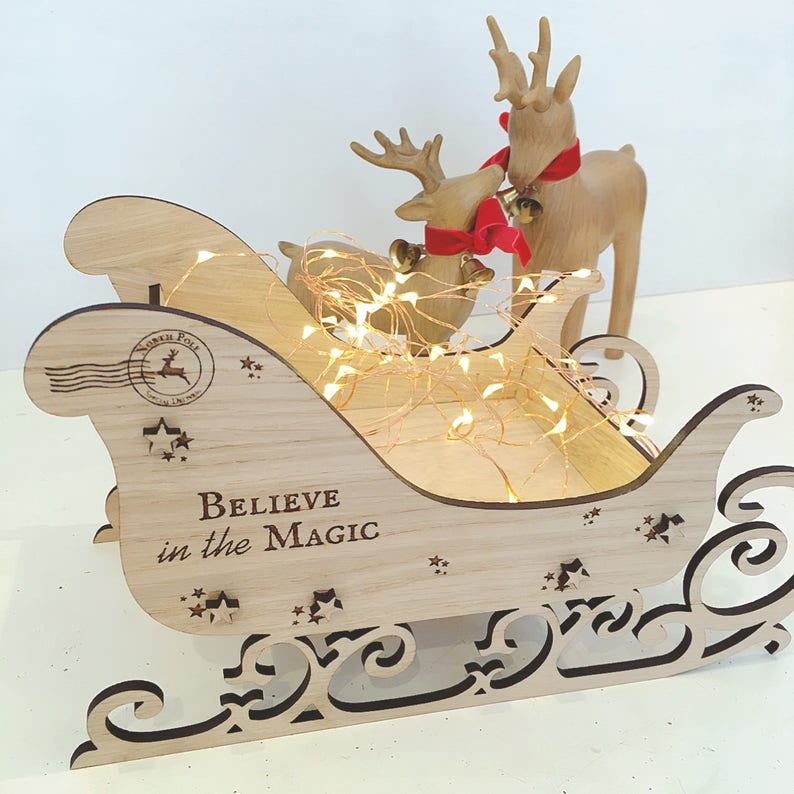 They are constructed with high quality 4mm veneered oak wood, then laser engraved with a christmas postage style stamp and 'believe in the magic' wording (if you would like something else please contact us.